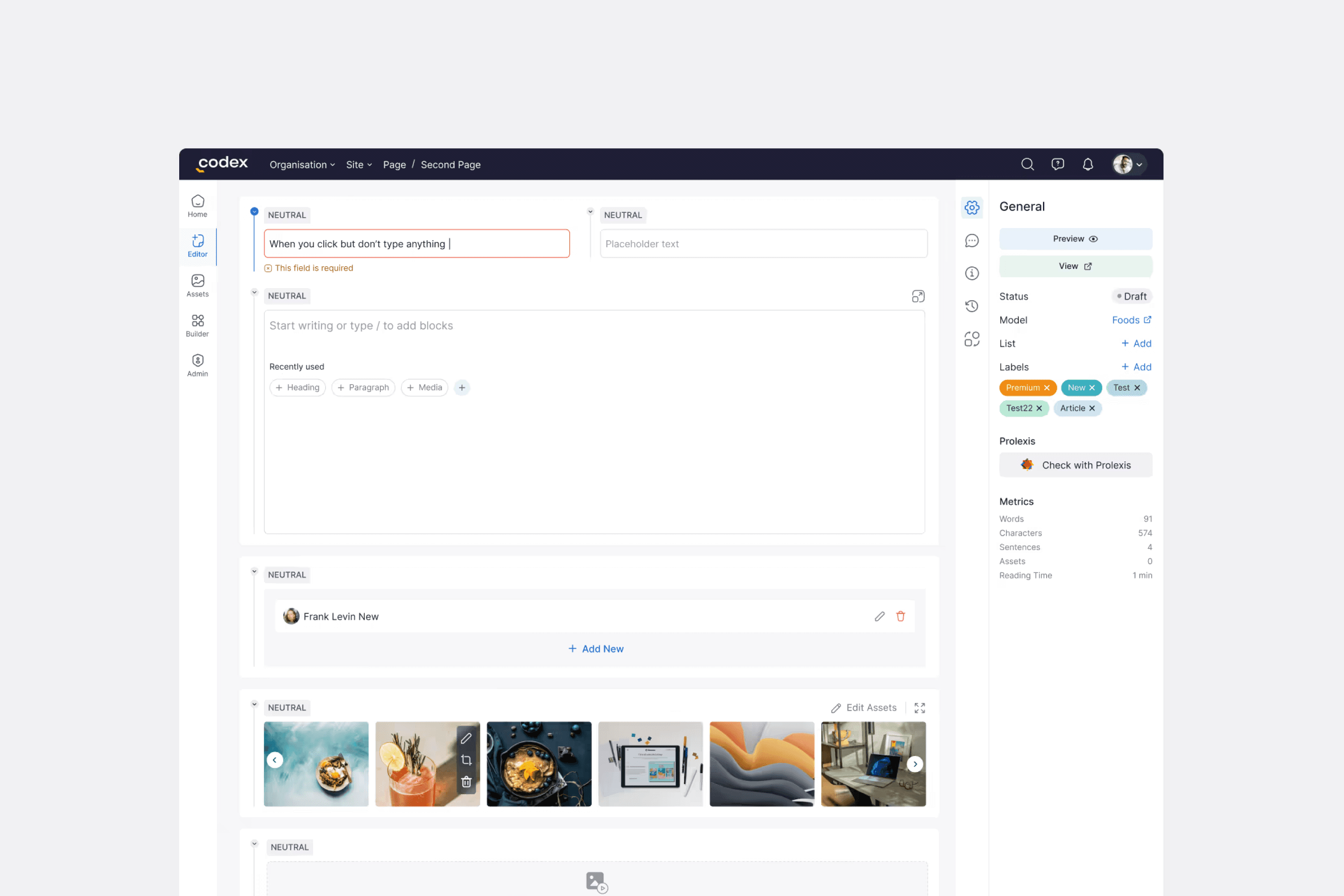 I collaborated closely with lead developers to define the functionality of the Content Editor with Blocks, as it was the core feature of Codex.